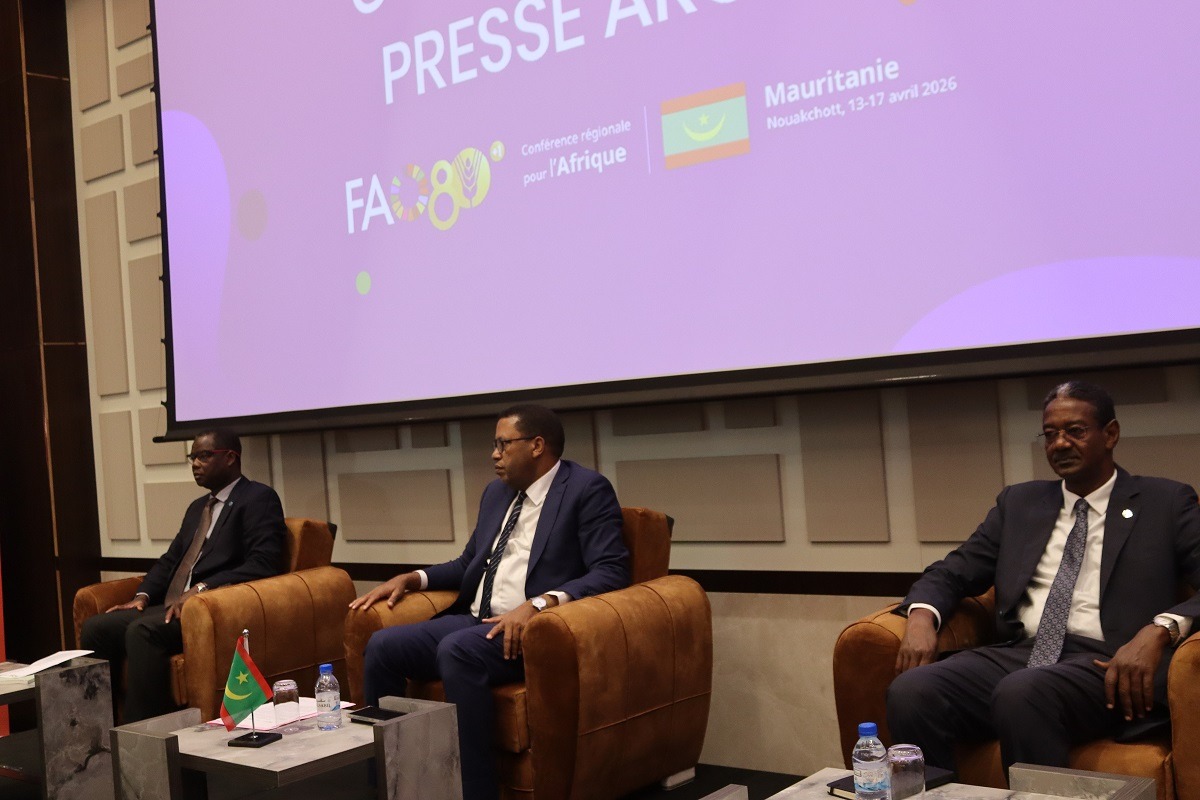 En prélude à la Conférence régionale de la FAO dont l’ouverture est prévue le 13 avril 2026 à Nouakchott, une conférence de presse préparative a eu lieu le 9 avril 2026 en présence du Secrétaire général du Ministère de l’Agriculture et de la Souveraineté Alimentaire, M. Ahmed Salem Ould EL Arbi, du Représentant de la FAO en Mauritanie, M. Jean Senahou et du Coordinateur de la Session au niveau du Bureau régional de la FAO pour l’Afrique du Nord basé à Tunis, M. Aymen Ameur.